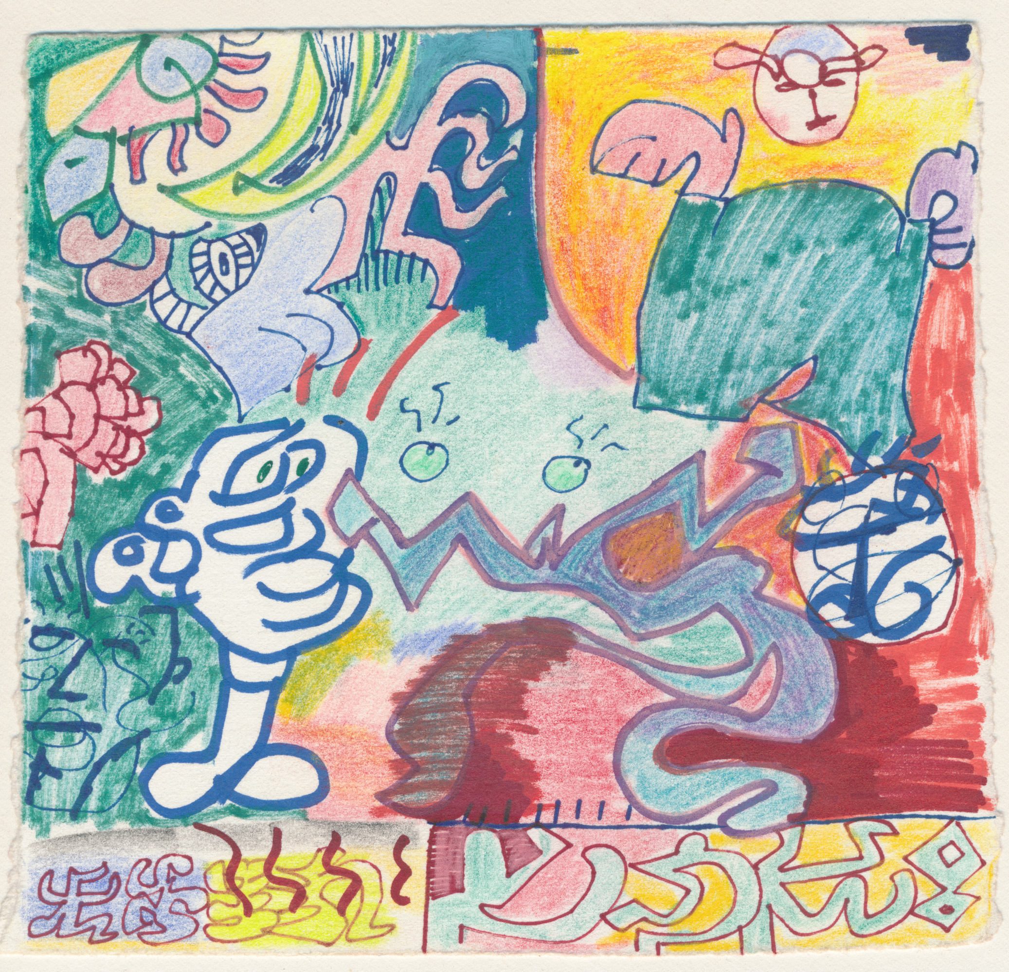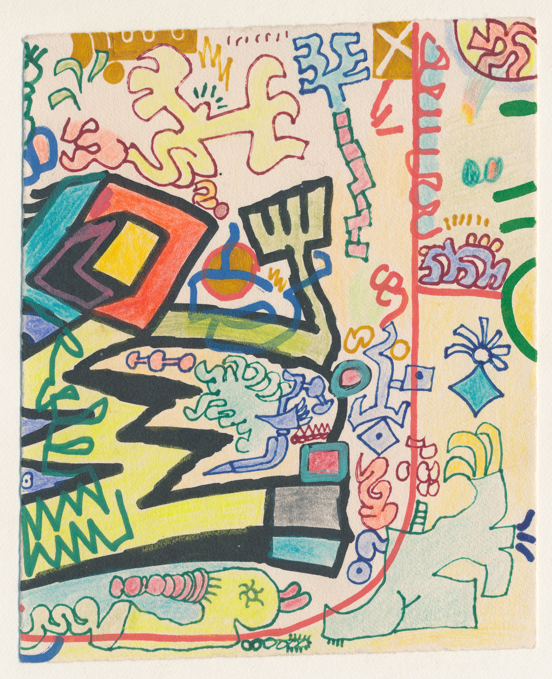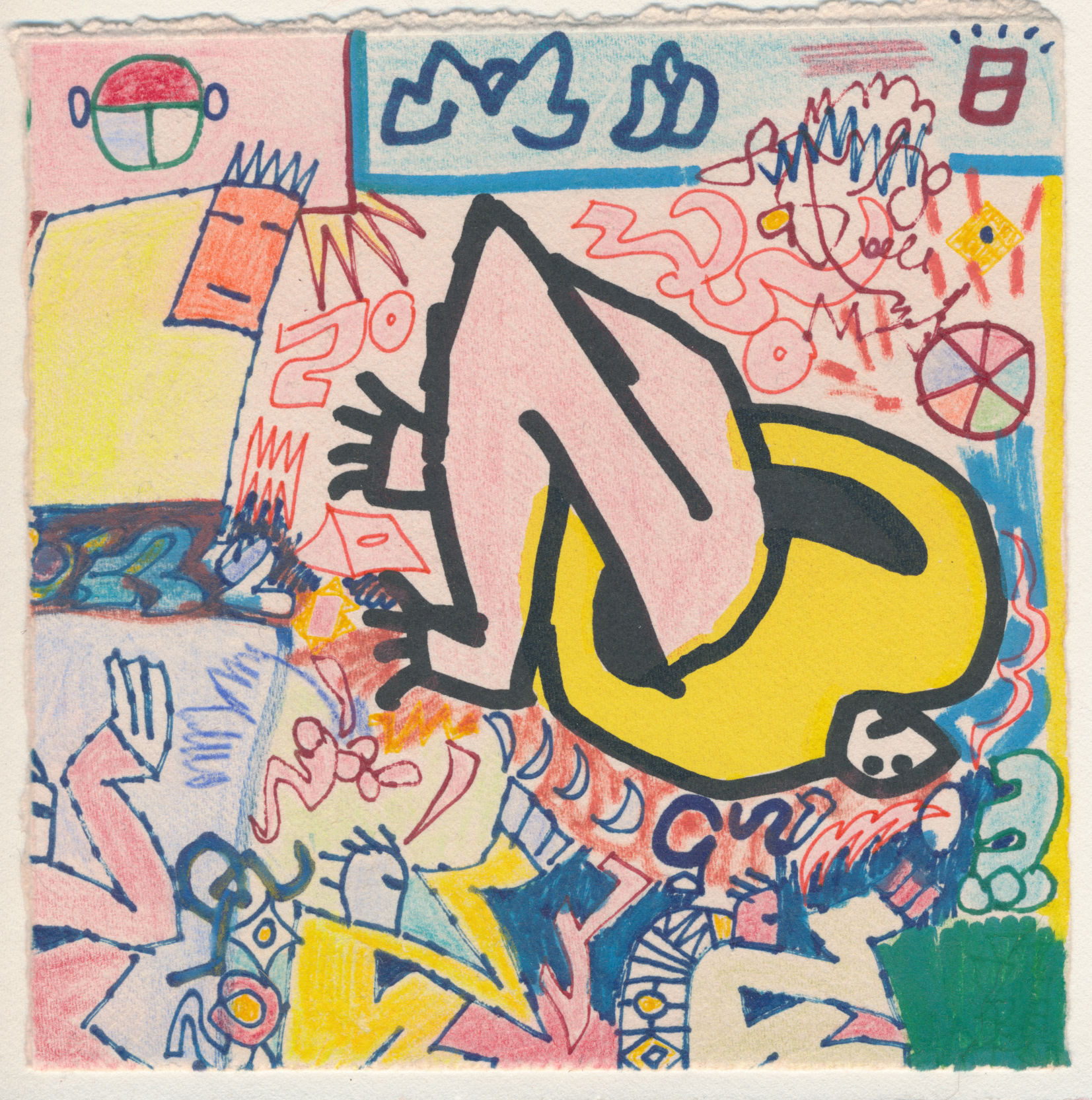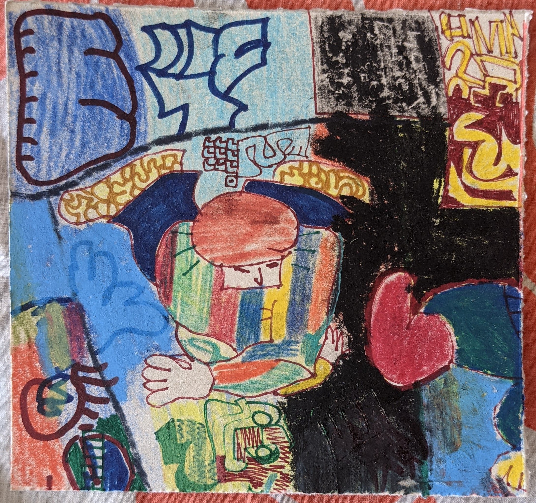 Pens, markers, pencil crayons and wax pastels on paper. These were drawn over offcuts from a screenprint I made in 2018.