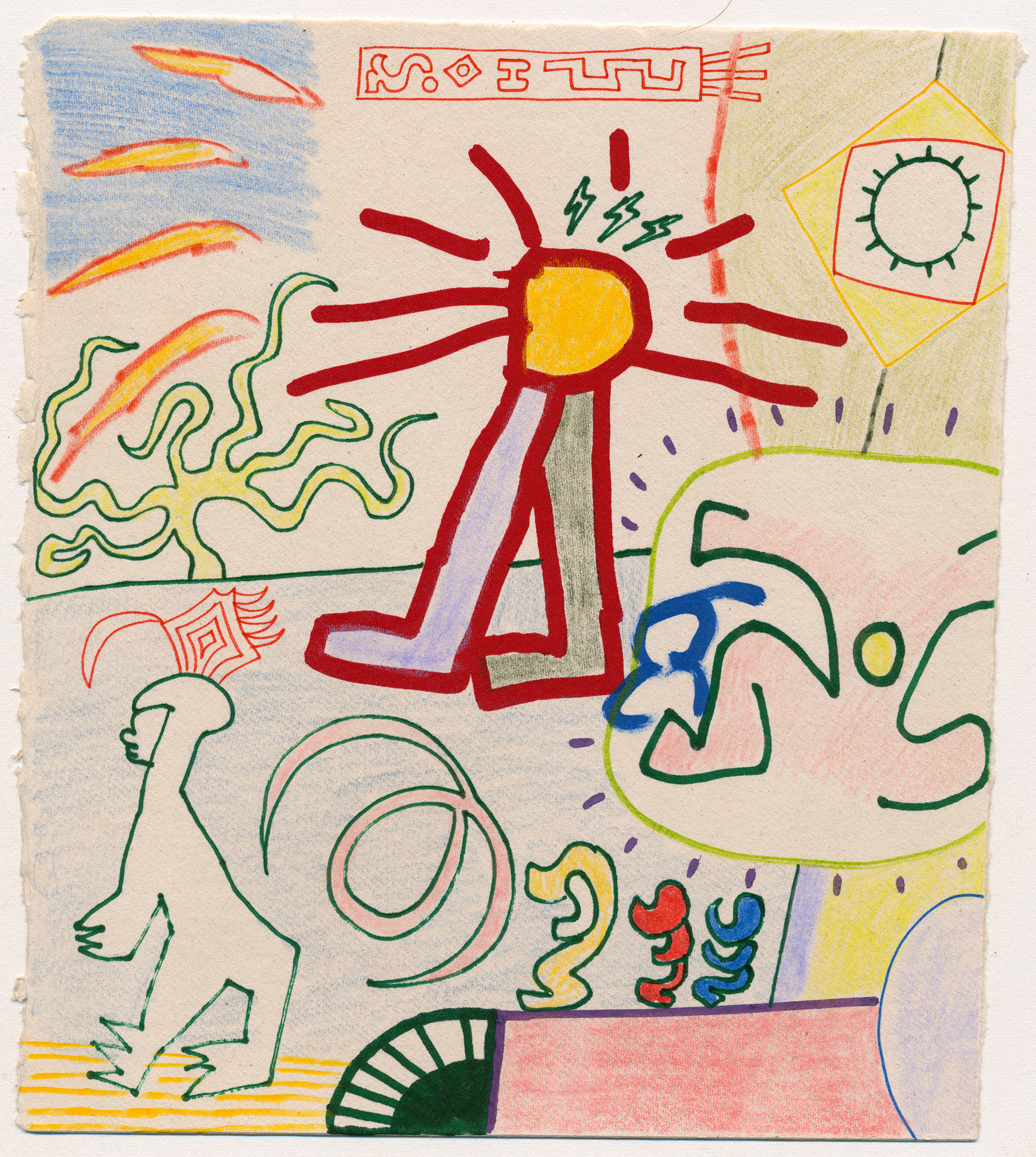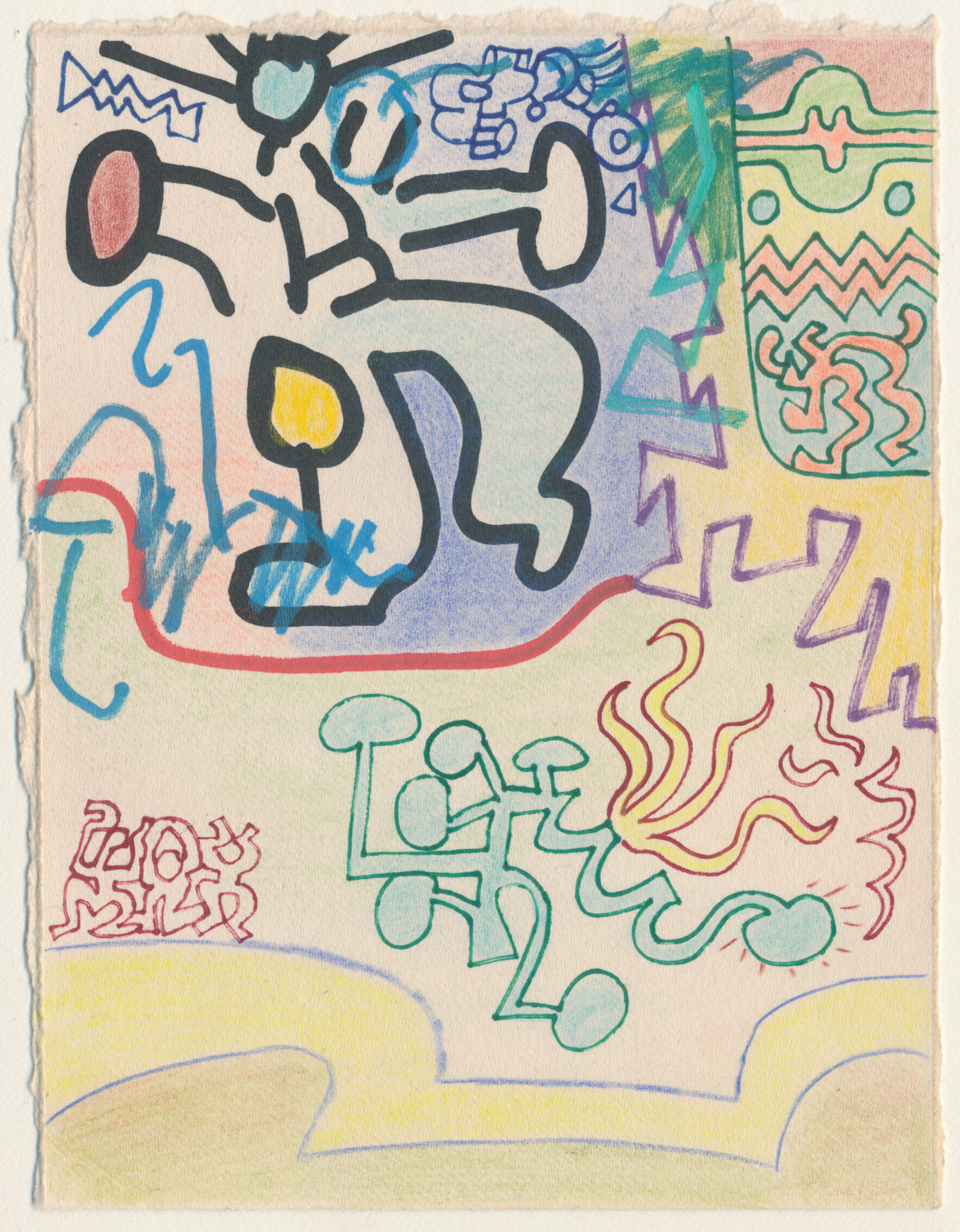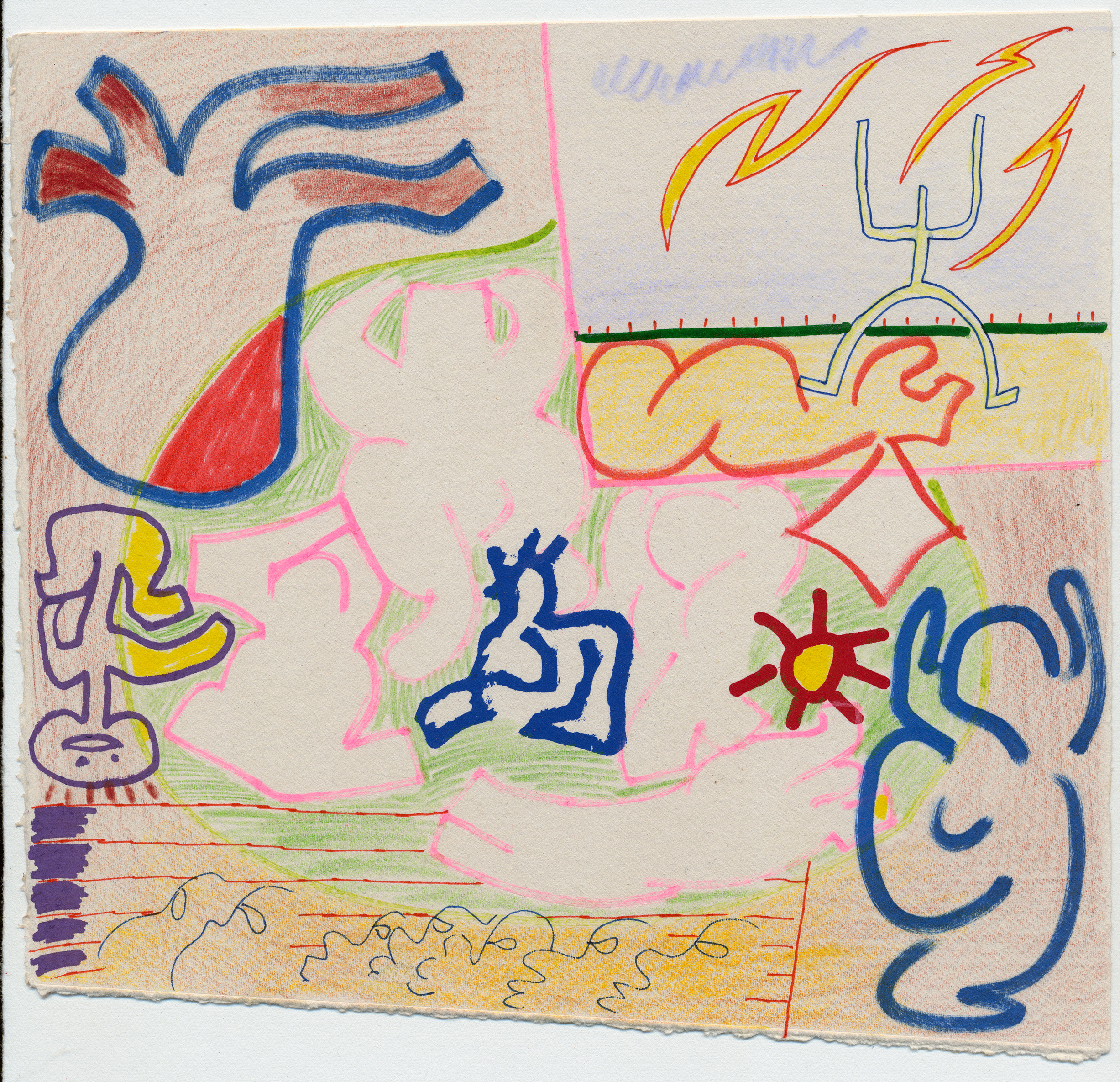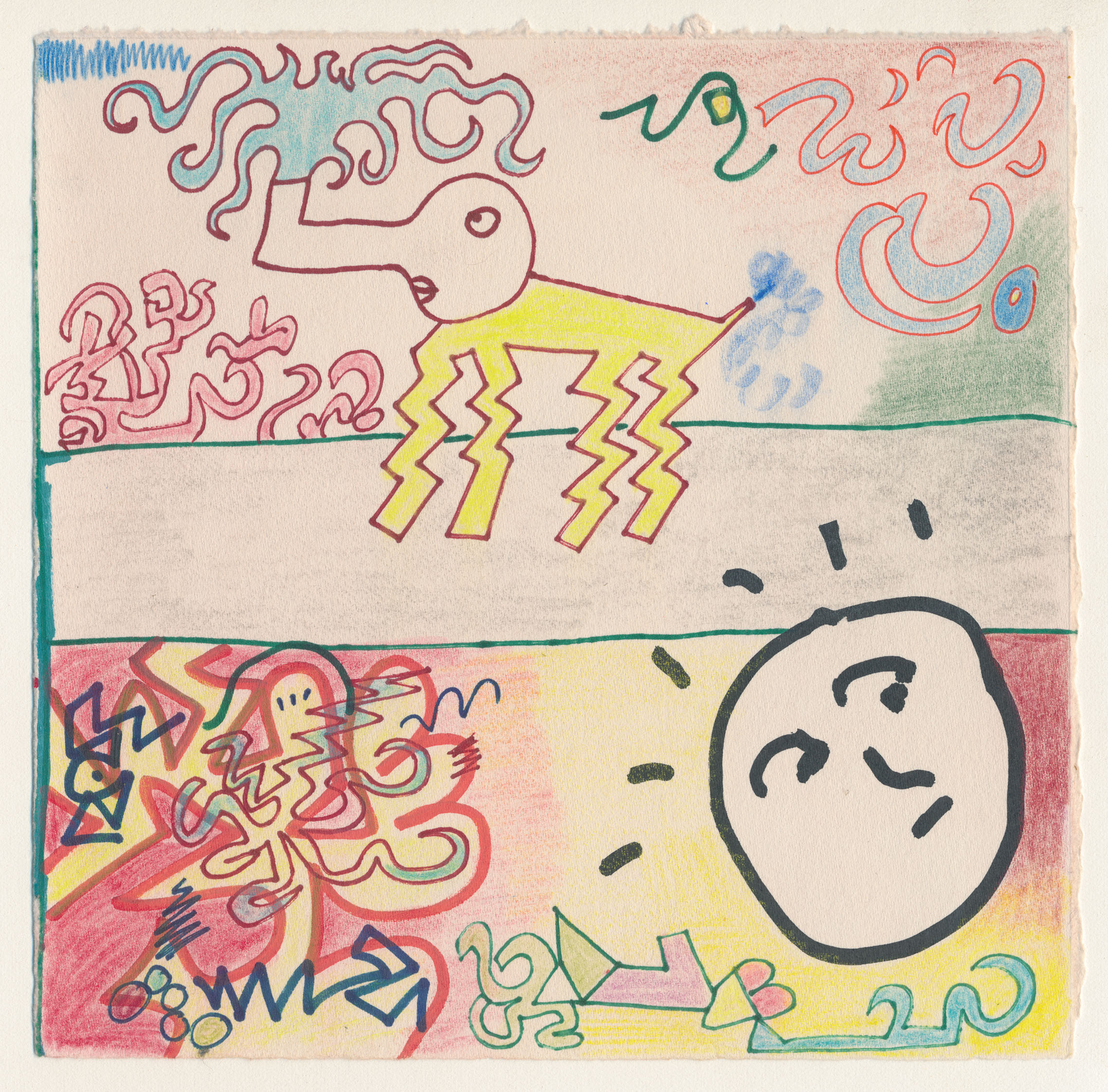 Pens, markers, pencil crayons and wax pastels on paper. These were drawn over offcuts from a screenprint I made in 2018.